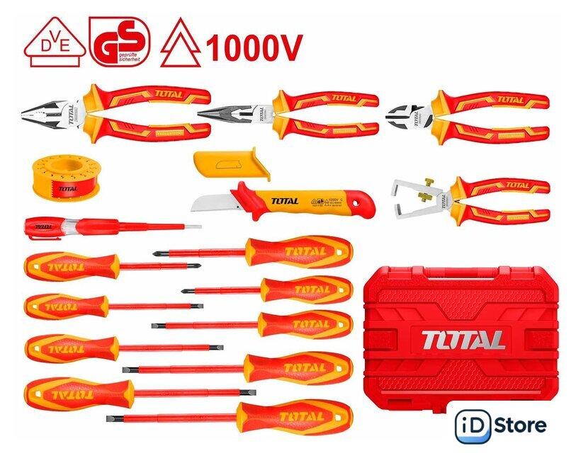 Комплектация | Изолированные бокорезы: 160 мм (6 дюймов) - 1 шт.Клещи для зачистки изоляции проводов: 160 мм (6 дюймов) - 1 шт.Изолированные длинногубцы: 200 мм (8 дюймов) - 1 шт.Изолированные комбинированные плоскогубцы: 200 мм (8 дюймов) - 1 шт.Изолированная шлицевая отвертка: SL3.0*75 мм, SL4.0*100 мм, SL5.5*125 мм, SL6.5*150 мм - 4 шт.Изолированная отвертка Phillips: PH00*50 мм, PH0*60 мм, PH1*80 мм, PH2*100 мм, PH3*150 мм - 5 шт.Индикаторная отвертка: 3 мм * 70 мм - 1 шт.Нож для кабеля: 50*180 мм - 1 шт.Виниловая изолента - 1 шт.Кейс |