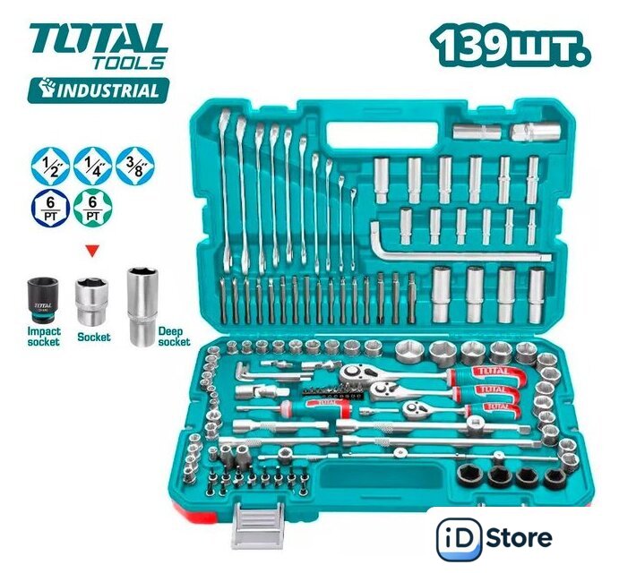 Комплектация | Трещотки (1/4'', 3/8'', 1/2'') - 3 шт. Торцевые шестигранные головки 1/4'' (6, 7, 8, 9, 10, 11, 12, 13 мм) - 8 шт. Торцевые шестигранные головки 3/8'' (10, 11, 12, 13, 14, 15, 16, 17, 18 мм) - 9 шт. Торцевые шестигранные головки 1/2'' (14, 15, 16, 17, 18, 19, 20, 21, 22, 24, 27, 30, 32 мм) - 13 шт. Ударные торцевые шестигранная головки 1/2'' (17, 19, 21, 22 мм) - 4 шт. Торцевые головки TORX 3/8'' (E8, E10, E11, E12, E14, E16) - 6 шт. Глубокие шестигранные головки 1/4'' (6, 7, 8, 10, 12, 13 мм) - 6 шт. Глубокие шестигранные головки 3/8'' (8, 10, 12, 13, 14, 15 мм) - 6 шт. Глубокие шестигранные головки 1/2'' (17, 18, 19, 22 мм) - 4 шт. Свечные головки 1/2'' (16, 21 мм) - 2 шт. Удлинители 1/4'' (50, 100 мм) - 2 шт. Удлинители 3/8'' (150, 250 мм) - 2 шт. Удлинители 1/2'' (125, 250 мм) - 2 шт. Скользящая планка "Т" 3/8" 9x160 мм - 1 шт. Скользящая планка "Т" 1/4" - 1 шт. Трехходовой адаптер 1/4'' (3/8''(F) * 1/4''(M)) - 1 шт. Трехходовой адаптер 1/2'' (3/8''(F) * 1/2''(M) - 1 шт. Универсальный шарнир (1/4'', 3/8'', 1/2'') - 3 шт. Вороток 1/4'' * 150 мм - 1 шт. Ручка 1/2"*10" L - 1 шт. Держатель бит 1/4'' * 6,35 мм - 1 шт. Держатель бит 3/8" * 8 мм - 1 шт. Держатель бит 1/2" * 8 мм - 1 шт. Биты Hex 1/4'' * 25 мм (SL3, SL4, SL5, SL6, PH0, PH1, PH2, PH3, PZ0, PZ1) - 10 шт. Биты 8x70 мм (PH1, PH2, PH3, H6, H7, H8, H10, H12, SL5.5, SL6.5, T20, T30, T40, T45, T50, T55) - 16 шт. Головки биты Hex 1/4'' * 32 мм (PH1, PH2, H3, H4, H5, H6, SL4, SL5.5, SL6.5, T8, T10, T15, T20, T25, T30, T40) - 16 шт. Комбинированне гаечные ключи (8, 10, 12, 13, 14, 15, 16, 17, 18, 19 мм) - 10 шт. Набор шестигранных ключей: (1.5, 2, 2.5, 3, 4, 5, 5.5, 6 мм) - 8 шт. Кейс |