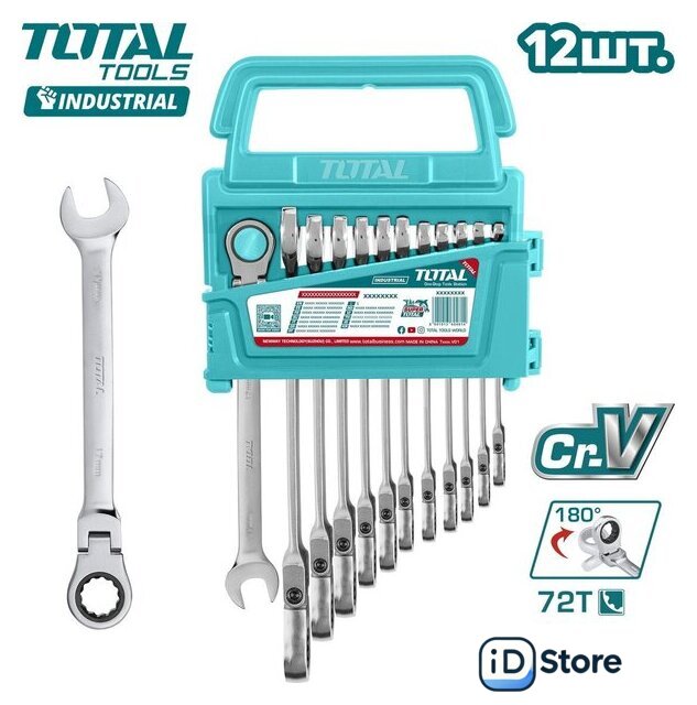 Комплектация | Набор комбинированных ключей с трещоткой и шарниром (8 мм, 9 мм, 10 мм, 11 мм, 12 мм, 13 мм, 14 мм, 15 мм, 16 мм, 17 мм, 18 мм, 19 мм) - 12 шт.Пластиковый держатель для хранения |