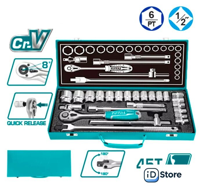 Комплектация | Трещотка 1/2" 45T - 1 шт.Тоцевые головоки 1/2" (10, 11, 12, 13, 14, 15, 16, 17, 18, 19, 20, 21, 22, 23, 24, 27, 30, 32 мм) - 18 шт.Универсальный шарнир 1/2 дюйма - 1 шт.Удлинитель 1/2" (125 мм) - 1 шт.Удлинитель 1/2" (250 мм) - 1 шт.Вороток T-образный с бегунком 1/2" (250 мм) - 1 шт.Рукоятка с шарниром 1/2" (375 мм) - 1 шт.Кейс |