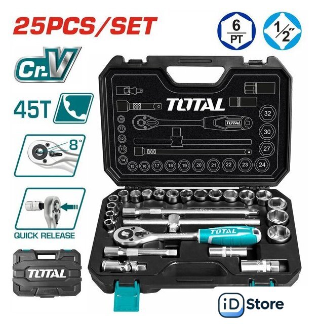 Комплектация | Трещотка 1/2" 45T - 1 шт.Тоцевые головоки 1/2" (10, 11, 12, 13, 14, 15, 16, 17, 18, 19, 20, 21, 22, 23, 24, 27, 30, 32 мм) - 18 шт.Свечные головки 1/2" (16 мм и 21 мм) - 2 шт.Универсальный шарнир 1/2 дюйма - 1 шт.Удлинитель 1/2" (125 мм) - 1 шт.Удлинитель 1/2" (250 мм) - 1 шт.Вороток T-образный с бегунком 1/2" (250 мм) - 1 шт.Кейс |