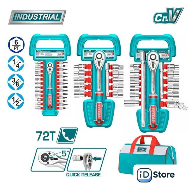 | Комплектация | Набор инструментов 1/4": Трещотка 72T 1/4" - 1 шт. Торцевые головоки 1/4" (4 / 4,5 / 5 / 6 / 7 / 8 / 9 / 10 / 11 / 12 / 13 / 14) - 12 шт. Торцевые головоки-биты 1/4" (SL4 / SL5,5 / SL7 / PH1 / PH2 / T10 / T15 / T20 / T25 / T30 / H4 / H5 / H6 / H7) - 14 шт. Пластиковый подвес для храненияНабор инструментов 3/8": Трещотка 72T 3/8" - 1 шт. Торцевые головоки 3/8" (8 / 10 / 11 / 12 / 13 / 14 / 15 / 16 / 17 / 19) - 12 шт. Удлинитель 3/8" (150 мм) - 1 шт. Пластиковый подвес для храненияНабор инструментов 1/2"": Трещотка 72T 1/2" - 1 шт. Торцевые головоки 1/2" (10 / 11 / 12 / 13 / 14 / 15 / 16 / 17 / 18 / 19 / 21 / 24) - 12 шт. Свечная головка 16 мм - 1 шт. Универсальный шарнир 1/2" - 1 шт. Удлинитель 1/2" (125 мм) - 1 шт. Удлинитель 1/2" (250 мм) - 1 шт. Пластиковый подвес для хранения |
