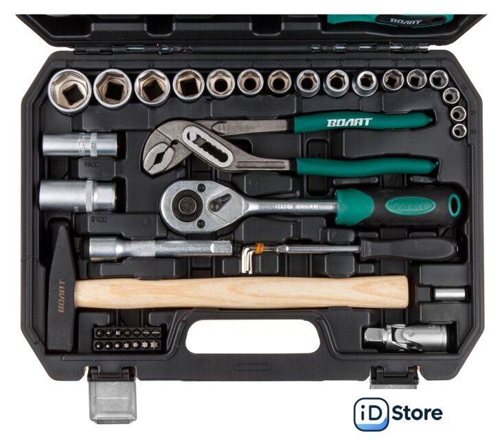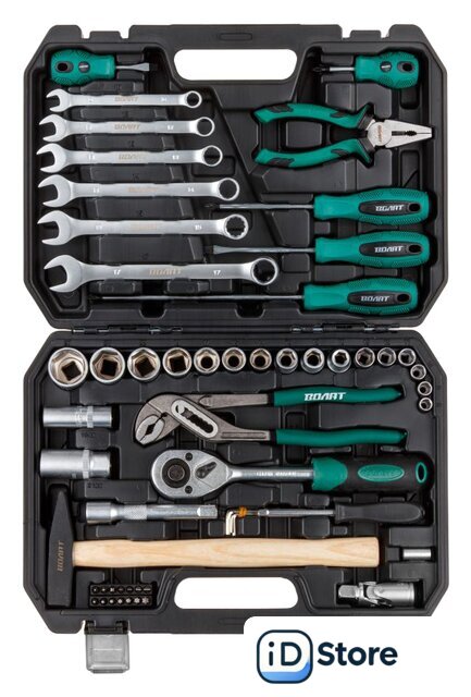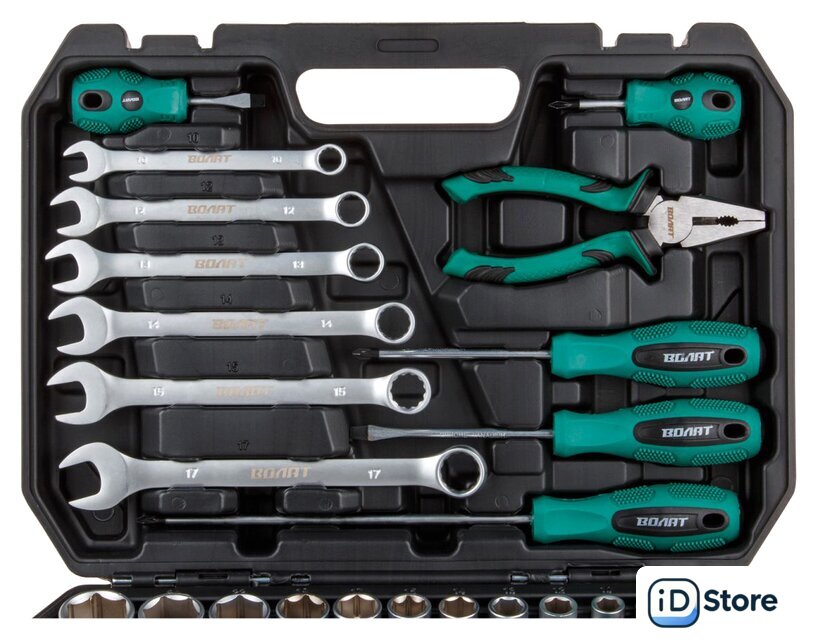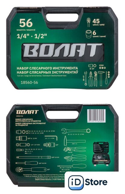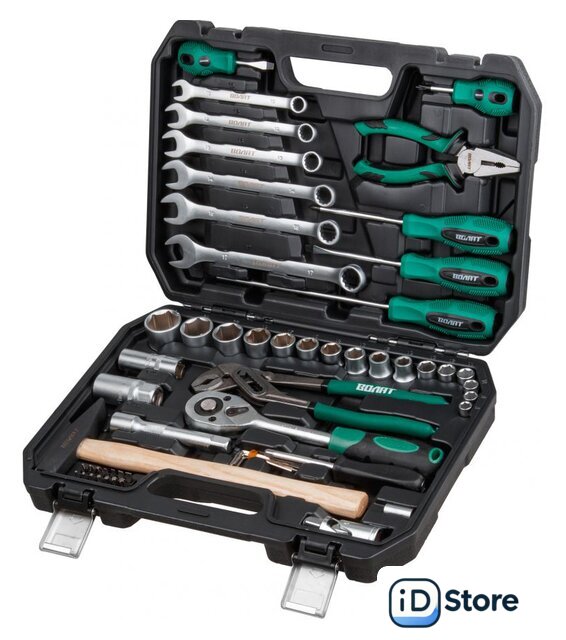 | Комплектация | Головка торцевая 1/4": 8, 9, 10, 11, 12, 13 ммГоловка торцевая 1/2": 10, 12, 13, 14, 15, 17, 19, 22, 24, 27 мм;Свечная головка 1/2": 16, 21 мм;Насадка 1/4" TORX: T10, T15, T20, T25, T27, T30, T40;Насадка 1/4" PH: PH1, PH2, PH3;Насадка 1/4" SL: SL3, SL4, SL5, SL6;Переходник (держатель для бит) 1/4"х1/4"(HEX);Вороток-отвертка 1/4" 150 мм;Трещотка 1/2";Удлинитель 1/2" 125 мм;Кардан 1/2";Ключ комбинированный: 10, 12, 13, 14, 15, 17 мм;Ключ шестигранный Г-обр.: 1.5, 2, 3, 4 мм;Отвертки: PH2x38, PH2x100, PZ2х200; SL6x38, SL6x100;Плоскогубцы 160 мм;Клещи переставные 250 мм;Молоток с деревянной рукояткой 300 г;Кейс |