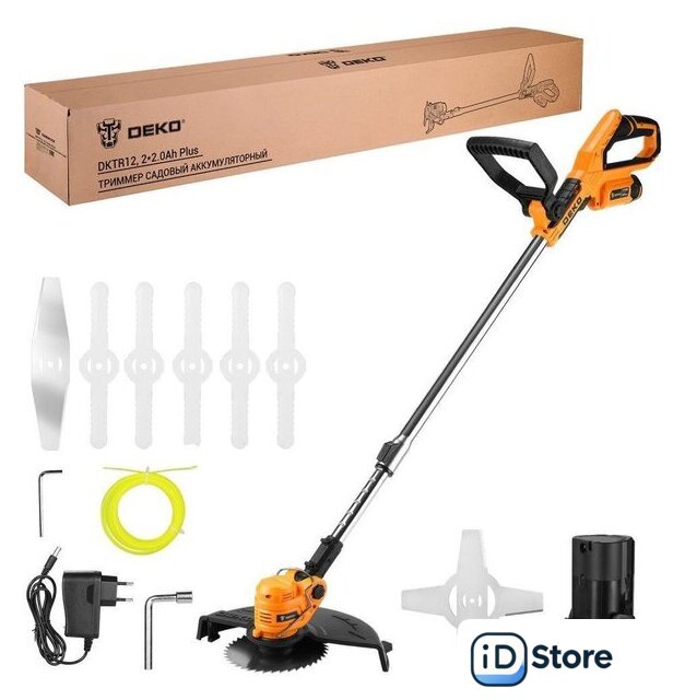 Комплектация | - Триммер - 1 шт.- Аккумулятор 2,0 Ач - 2 шт.- Зарядное устройство - 1 шт.- Пластиковые ножи - 5 шт.- Металлический нож - 1 шт.- Металлический нож 4Т - 1 шт.- Металлический диск - 1 шт.- Леска - 1 шт.- Шестигранный ключ - 1 шт.- Торцевой ключ с внутренним шестигранником - 1 шт- Дополнительная рукоятка - 1 шт.- Защитный кожух - 1 шт.- Инструкция- Коробка |