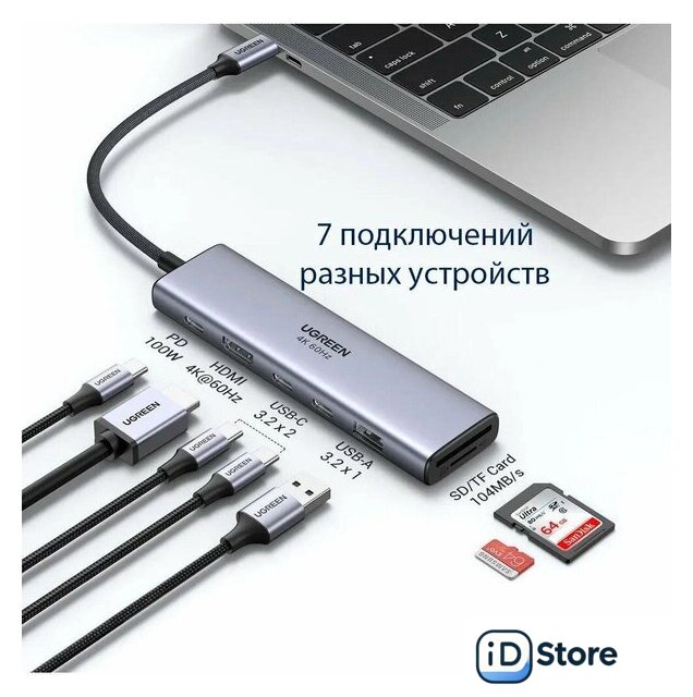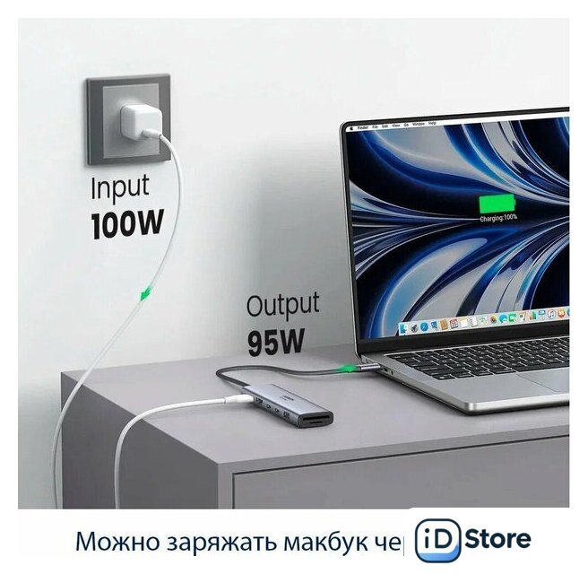 | Все разъемы на адаптере | USB-A 3.2 Gen2 (10 Гбит/с), USB-C 3.2 Gen2 (10 Гбит/с), HDMI, USB-C (только для зарядки) |