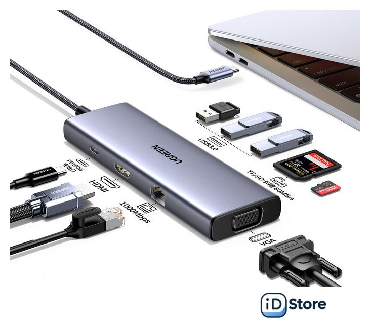 Все разъемы на адаптере | USB-A 3.2 Gen1 (5 Гбит/с), HDMI, VGA, RJ-45, USB-C (только для зарядки) |