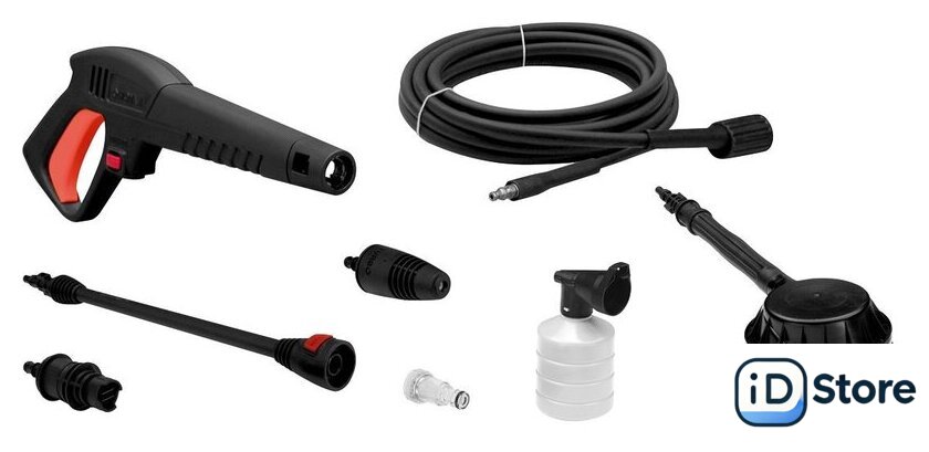 Комплектация | Очиститель высокого давления; Шланг высоконапорный - 8м; Пистолет; Удлинительная насадка; Грязевая фреза; Плоская фреза; Пеногенератор; Щетка вращающаяся; Фильтр тонкой очистки. |