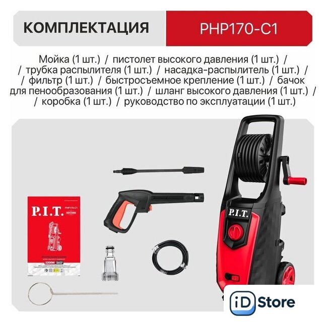 | Комплектация | - Мойка,, - коробка,, - пистолет высокого давления,, - трубка распылителя,, - насадка-распылитель,, - быстросъемное крепление,, - бачок для пенообразования,, - фильтр,, - шланг высокого давления,, - руководство по эксплуатации. |