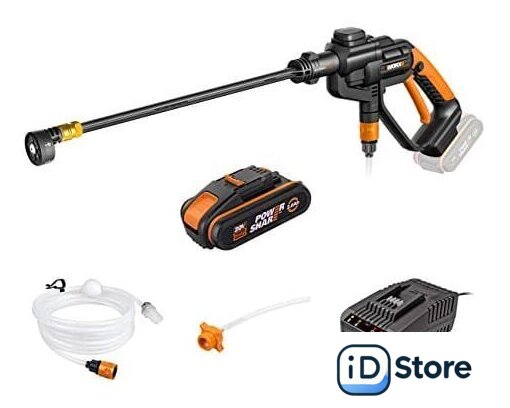 Комплектация | - Аккумуляторная мойка;- Батарея аккумуляторная Worx WA3551 2А/ч;- Зарядное устройство Worx WA3880 20В 2А;- Многофункциональная форсунка;- Сумка для переноски;- Короткая насадка;- Длинная насадка;- Шланг для забора воды из емкости 6 м;- Руководство по эксплуатации. |