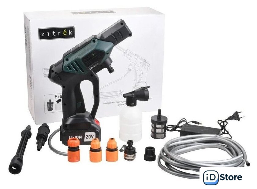 Комплектация | - Мойка;- Шланг;- Штанга;- Аккумулятор 4 Ач;- Емкость для моющего средства;- Фильтр;- Коннектор для шланга;- Насадка;- Быстроразъемный соединитель;- Штуцер для садового полива;- Руководство по эксплуатации. |