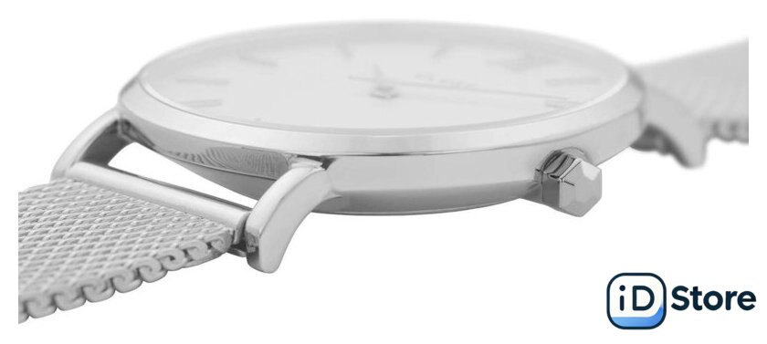 серебристый корпус, черный циферблат, серебристый браслет, миланский ремешок