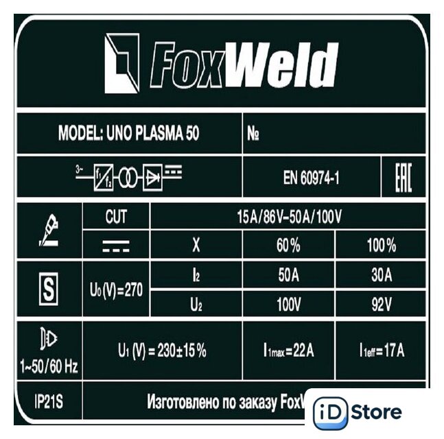 | Комплект поставки | • Аппарат плазменной резки UNO PLASMA 50 – 1 шт.;• Плазмотрон PT-31, 3 м. – 1 шт.;• Зажим для заземления с кабелем, 2 м. – 1 компл.;• Рукав для подачи газа, 2 м. – 1 шт.;• Узел подготовки воздуха (редуктор-осушитель) – 1 шт.;• Комплект ЗИП – 1 шт.;• Инструкция – 1 шт.;• Гарантийный талон – 1 шт. |
