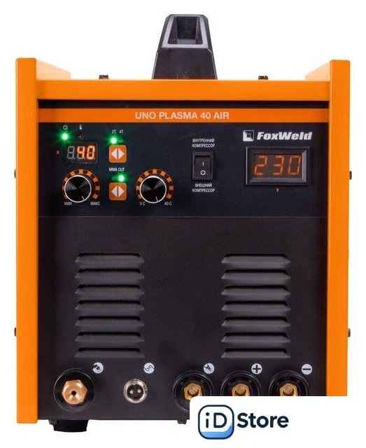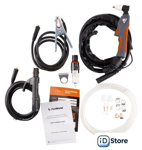 Комплект поставки | • Аппарат плазменной резки со встроенным компрессором UNO Plasma 40 Air – 1 шт.;• Плазмотрон PT-31, 3 м – 1 шт.;• Кабель заземления с зажимом, 2 м – 1 шт.;• Электрододержатель с кабелем КГ-1х20 мм, 200 А, 3 м – 1 шт.;• Штуцер для подсоединения узла подготовки воздуха – 2 шт.;• Газовый шланг 3 м – 1 шт.;• Инструкция – 1 шт.;• Гарантийный талон – 1 шт.Комплект ЗИП:• Катод – 2 шт.;• Сопло – 2 шт.;• Хомут – 4 шт. |