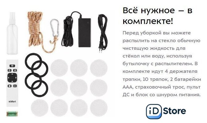 | Комплектация | - пульт ДУ, - документация, - сетевой кабель, - батарейки (2 шт.), - ткань для влажной уборки (10 шт.), - страховочный трос, - кольцо для салфеток (4 шт.), - флакон. |